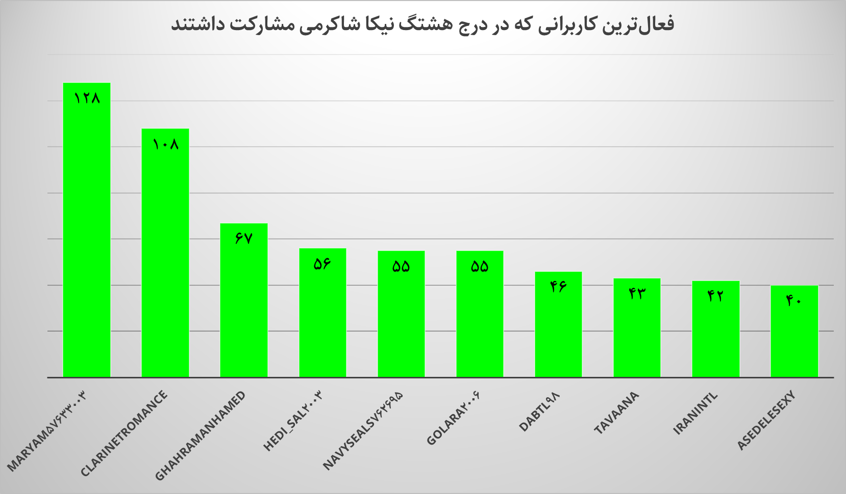 ۲. هویت نامشخص، فعالیت بسیار محدود و اعتبارِ کم اکانتهای فعال در انتشار هشتگ نیکا شاکرمی نشان میدهد هدایتکنندگان و فعالان این هشتگ بیش از آنکه به محتوای این هشتگ اندیشیده باشند، به همهگیری و فضاسازی آن فکر کردند زیرا اکانتی که بیش از ۱۰۰ توئیت از این هشتگ در طول سه روز منتشر کرده، نه اسم و هویت مشخصی داشته و نه اعتبار و فعالیت ممتد و ادامهداری.