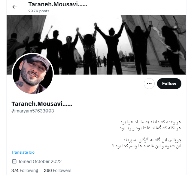 فعالترین کاربر در این کارزار، اکانتی به نام «ترانه موسوی» است که با شناسه کاربری «maryam۵۷۶۳۳۰۰۳» و گرایش برانداز فعالیت دارد. زمان پیوستن این کاربر به ایکس از یک سال گذشته و اواخر سال ۱۴۰۱ (سیزدهم مهرماه) و تعداد فالوورهایش ۳۵۵ نفر است.